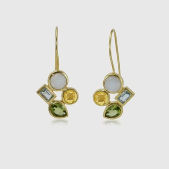 A handmade pair of gold vermeil Citrine, Peridot, Blue Topaz & Moonstone earrings by Devon based Guest Designer Banyan.
