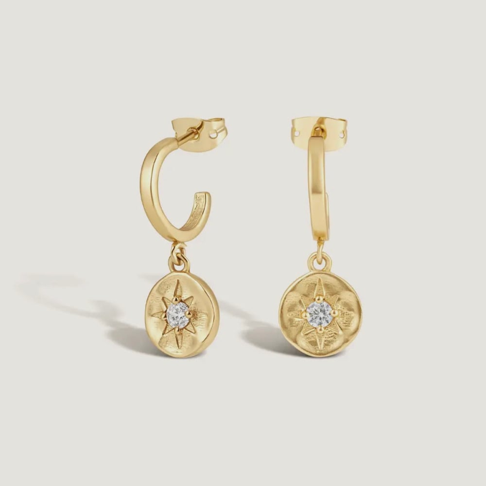 A little touch of textured magic. Cosmic hand hammered charms hang from a smooth gold huggie, detailed with a soft starburst and a sparkling diamante stone that catches the light with every move. Subtle, uplifting and quietly special, the perfect piece for moments that deserve to feel a little brighter.