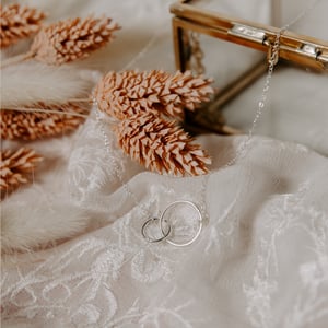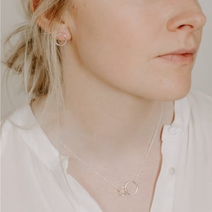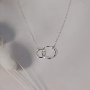 Our together necklace features a delicate duo of silver interlinked circles, of 2 different sizes presented on a silver trace chain.