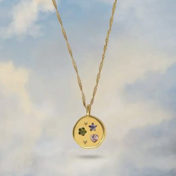 Heart, Star and Flower Gemstones symbolising good vibes and positive energy, set into a 14ct Gold Plated Pendant by Guest Designer Junk Jewels.