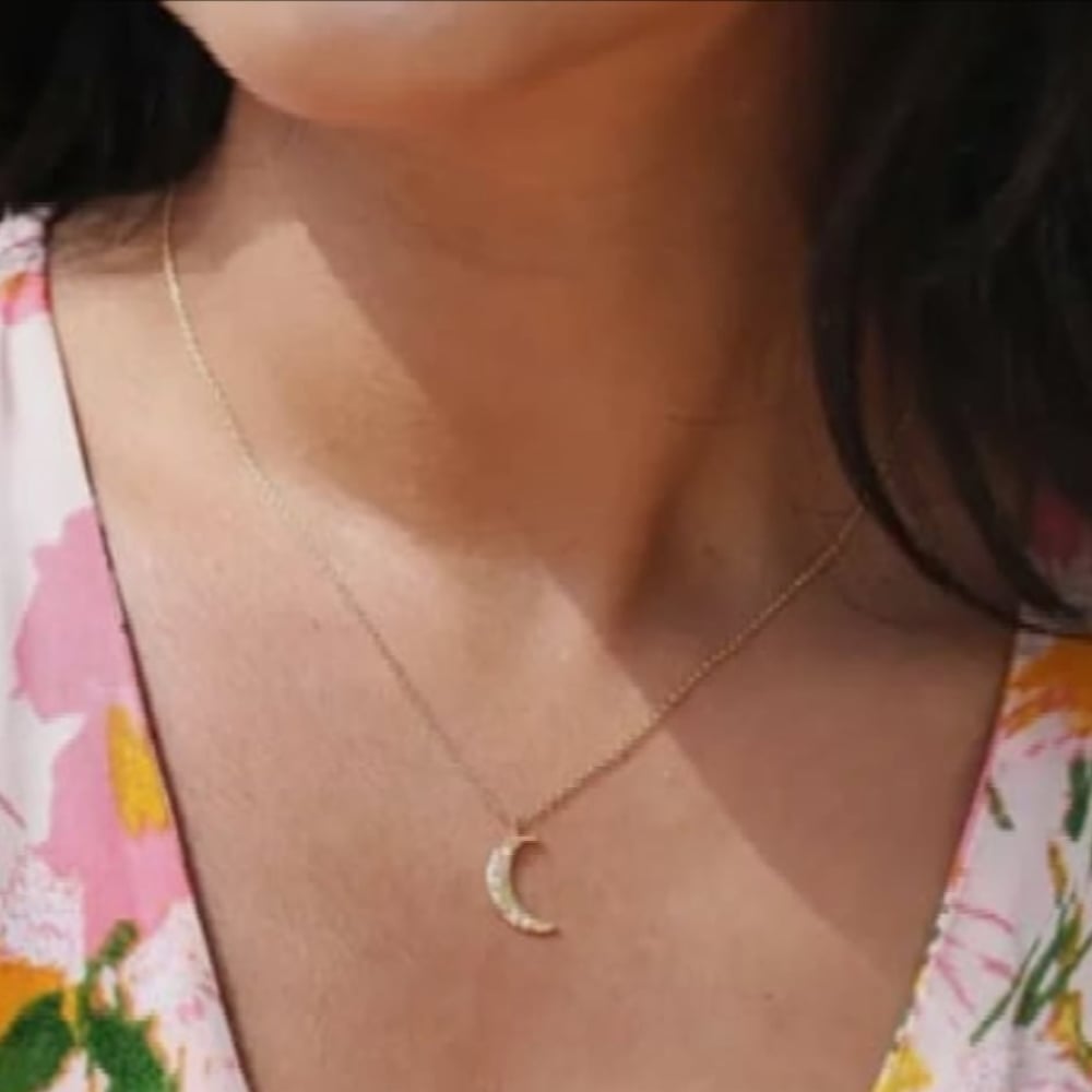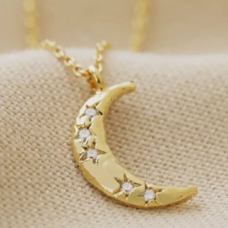 A Crystal Crescent Moon Necklace by Guest Designer Lisa Angel, is plated in 14ct Gold presented on a delicate trace chain.