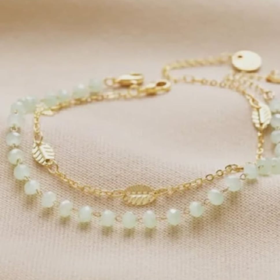 A set of 2 Bracelets, featuring green faceted beads and a 14ct Gold plated Leaf Chain by Guest Designer Lisa Angel.