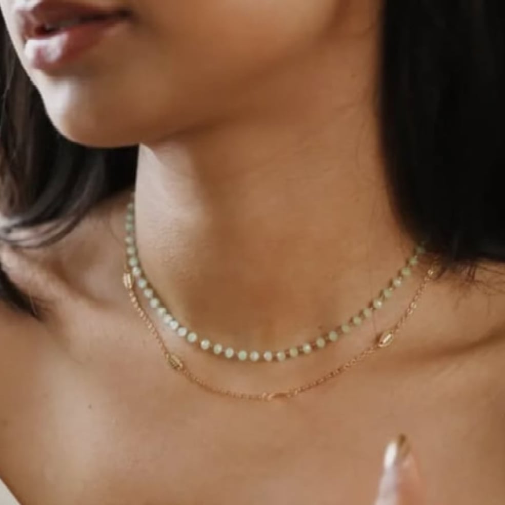 A set of 2 Necklace featuring green faceted beads and a 14ct Gold plated Leaf Chain by Guest Designer Lisa Angel.