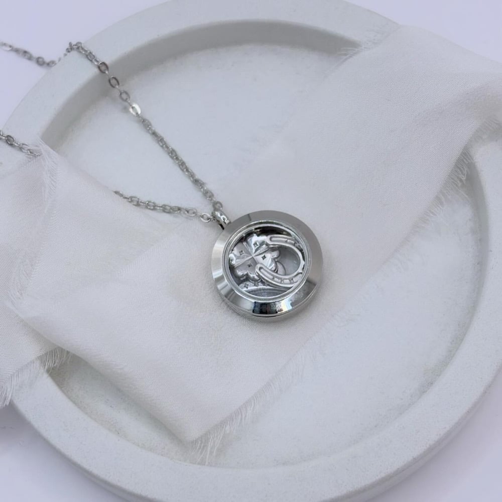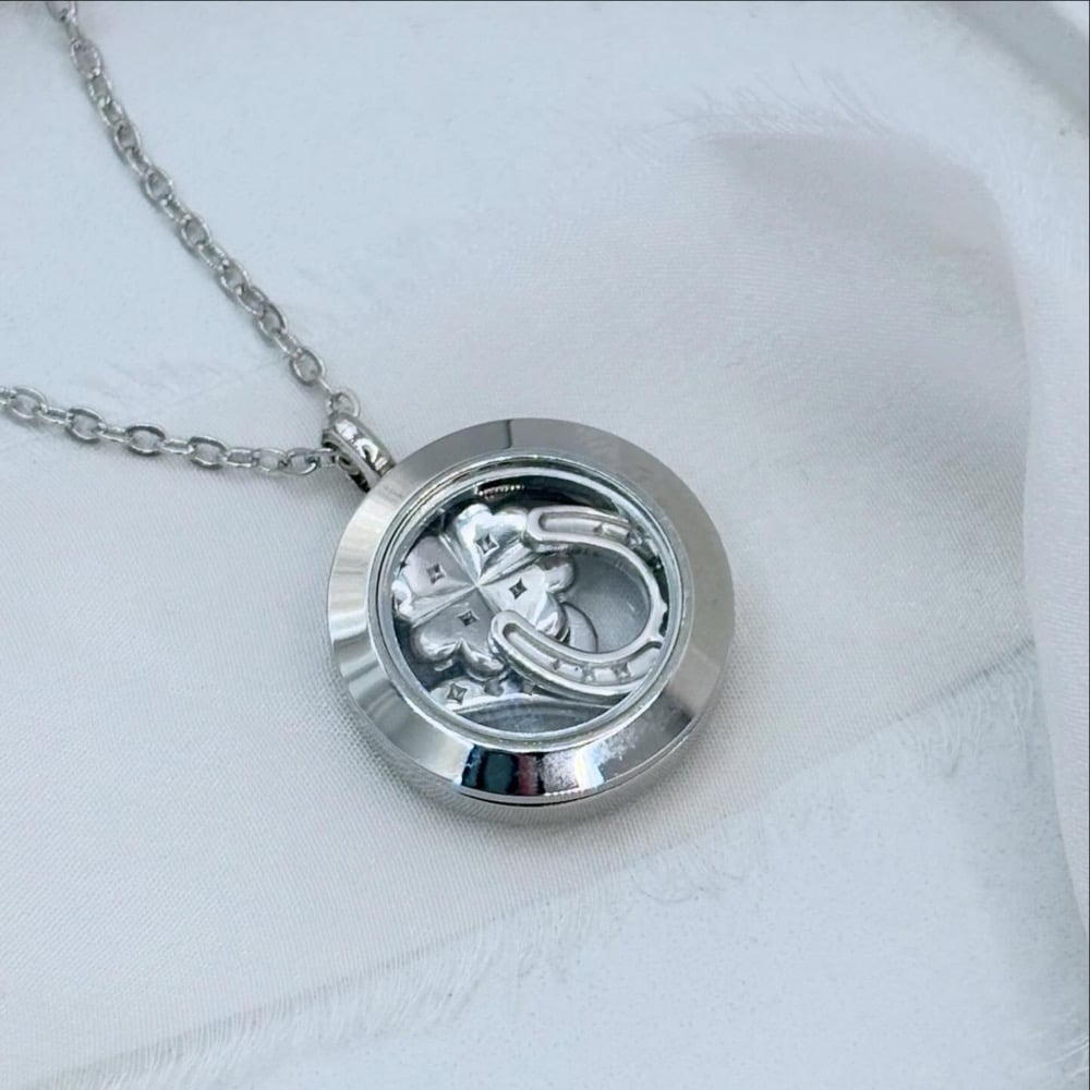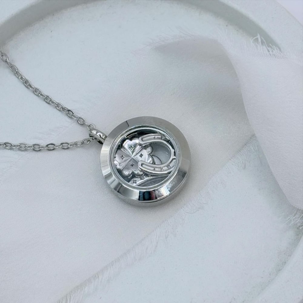 Encasing a 4 leaf clover, lucky number 7 and horseshoe silver charms, our lockets are available in a choice of either sterling silver or rhodium plated steel on an 18” silver chain.