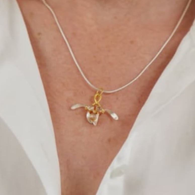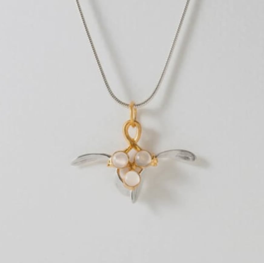 A stunning Silver, Gold and Moonstone Mistletoe Pendant presented on a Silver Snake Chain by Guest Designer Paula Bolton.