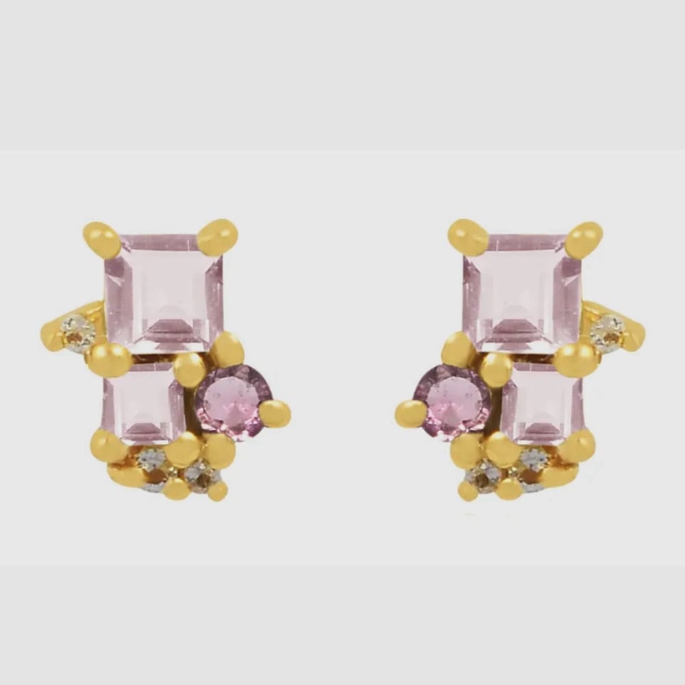 A beautiful cluster of Rose Quartz and Tourmaline Stud Gold Plated on Silver Earrings by Guest Designer Pomegranate.